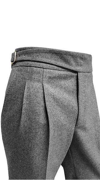 Medium Grey flannel Gurkha trousers made of heavyweight 340 g/m2 woolen flannel fabric from Vitale Barberis Canonico, ideal for the autumn/winter season.