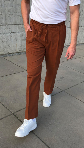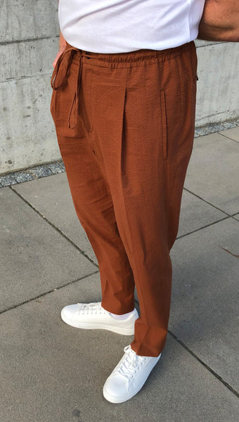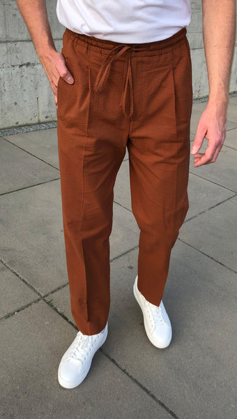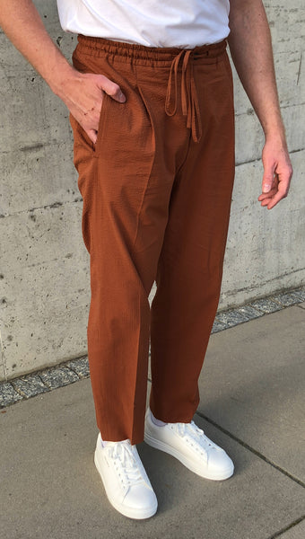 Seersucker trousers are great for warm season, the fabric sourced from Japan Mill is lightweight and breathable. This pair is tailored in regular wider fit than our Barnaba II and has elasticated drawstring waistband around the waist along with a functional fly.